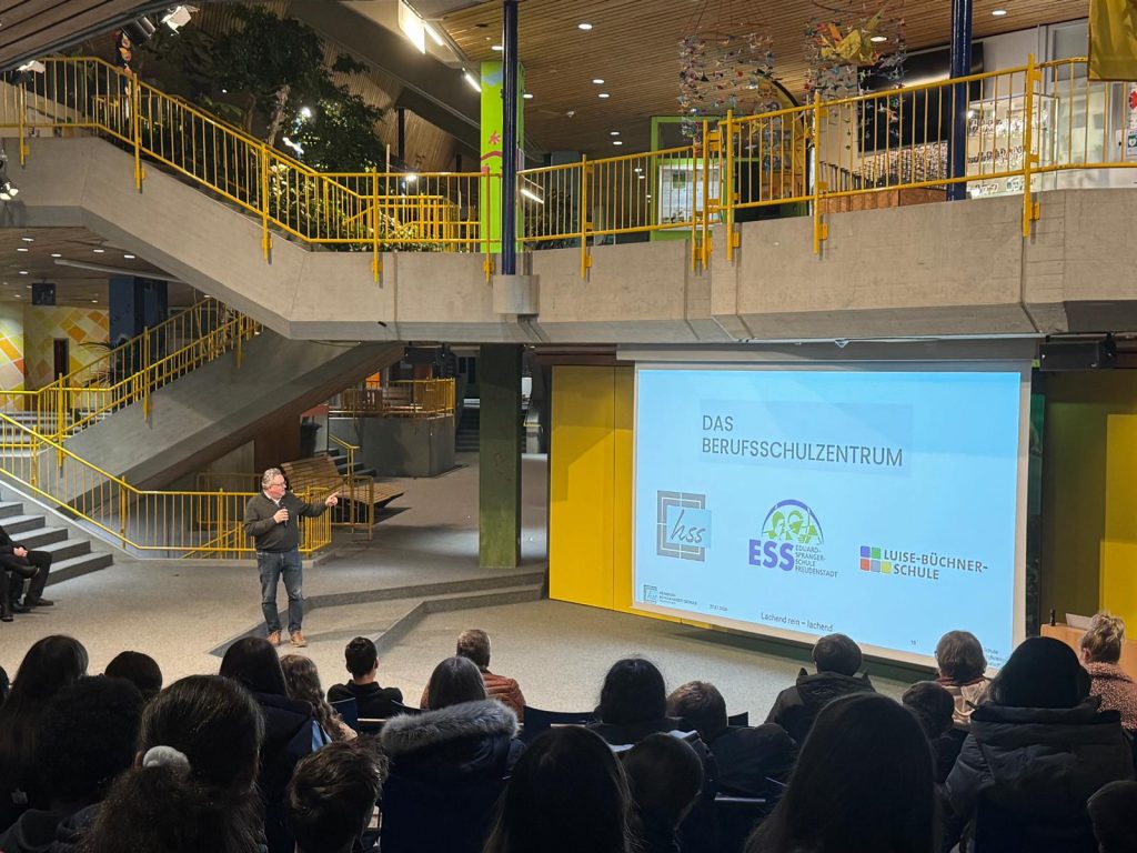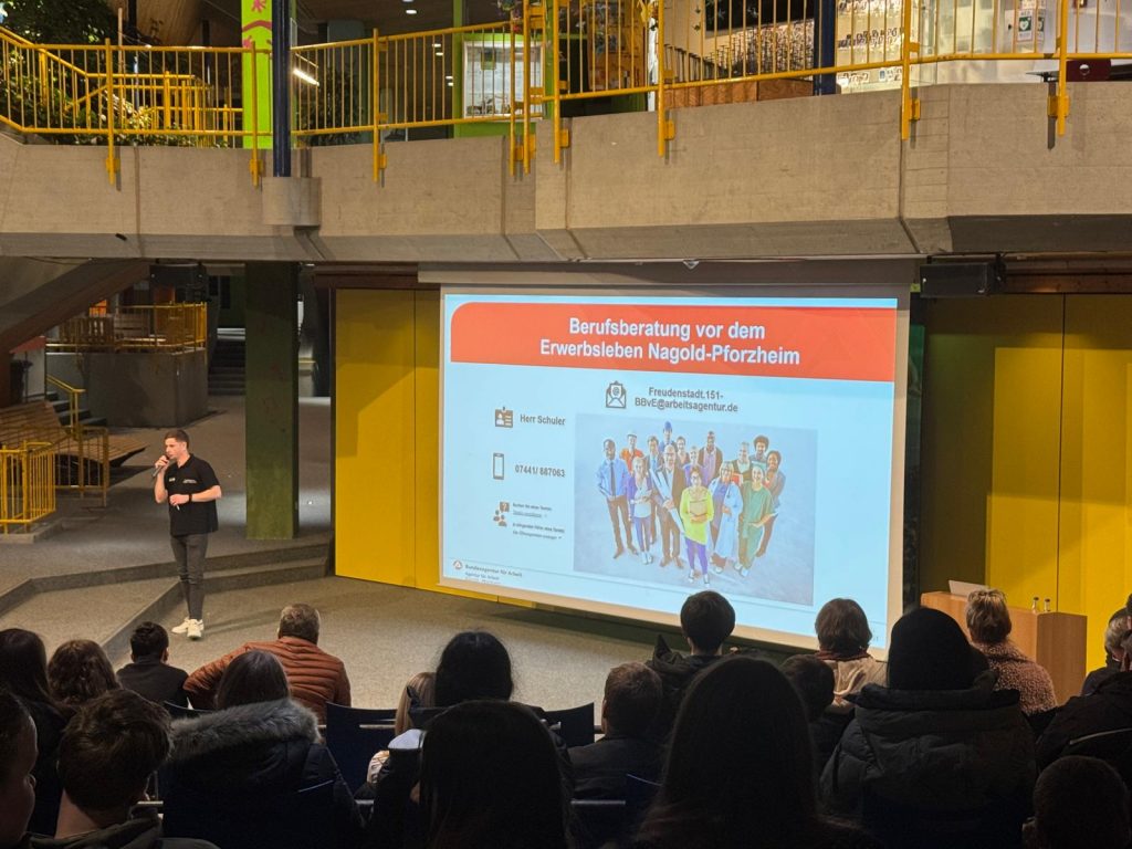Ein weiterer Programmpunkt war der Beitrag von Herrn Schuler von der Agentur für Arbeit, der das Angebot der Berufsberatung vorstellte und aufzeigte, wie Schülerinnen und Schüler individuell bei der Berufswahl unterstützt werden können.
